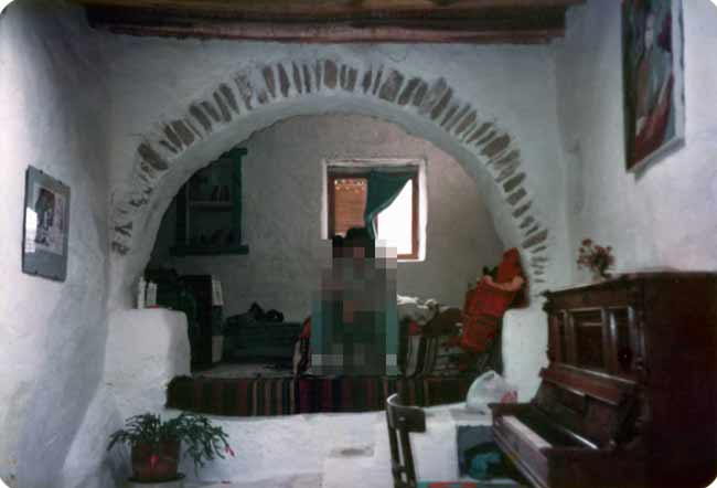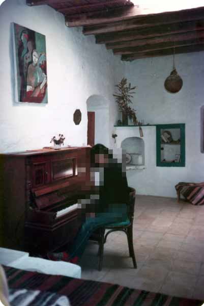 主(あるじ)後方のアーチの奥は、南欧によくあるぶどう棚の下にテーブルがしつらえている半屋外(半屋内?)になっていて、これを見て断然、ブドウ棚が欲しくなったのを覚えています。メインの玄関戸もここにあって、そこを開けるとピアノのある部屋に出ます。下の写真です。