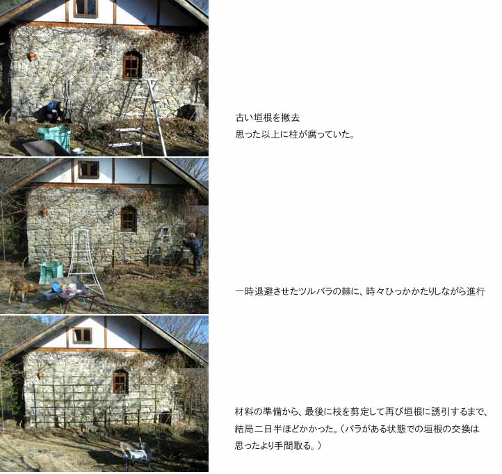 西側石壁のつるバラの垣根をやり変えました。この冬の「やるべき事のリスト」は例年にも増して盛りだくさんですが、この垣根工事も重要事項です。